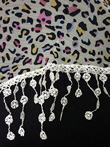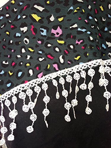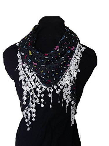 Product DescriptionBlack with funky multi coloured design, lace trimmed triangle Scarf Soft Summer Fashion London Fashion Fab Gift0