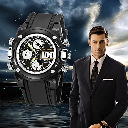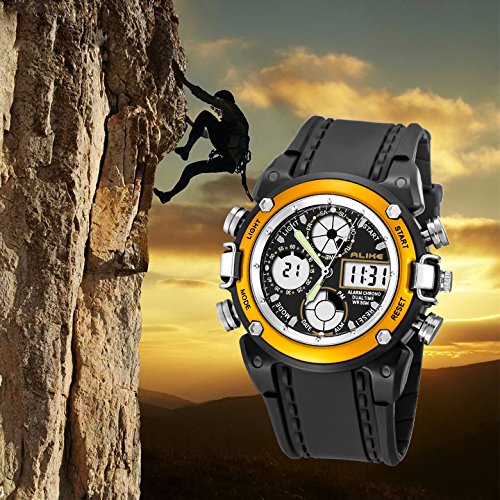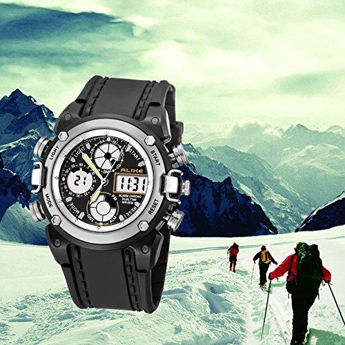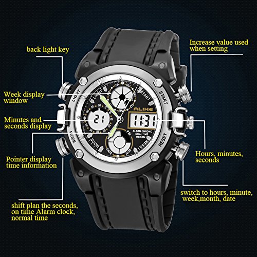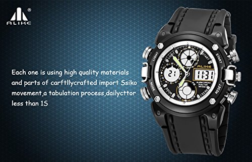 - Feature : Black Polyurethane sport watch featuring round dial with noctilucence, second chronograph function, alarm, week and time display! / Strong waterproof 164 feet(50M), suitable for kitchen, as well as washing hand in the daily life. But please don't press any button in the water / Japan fine workmanship movement quartz movement with digital display / Scratch resistant glasses case! Suitable for daily life or convenient to outdoor! / Shockproof which make your shopping no worries, QUANLITY GUARANTEE