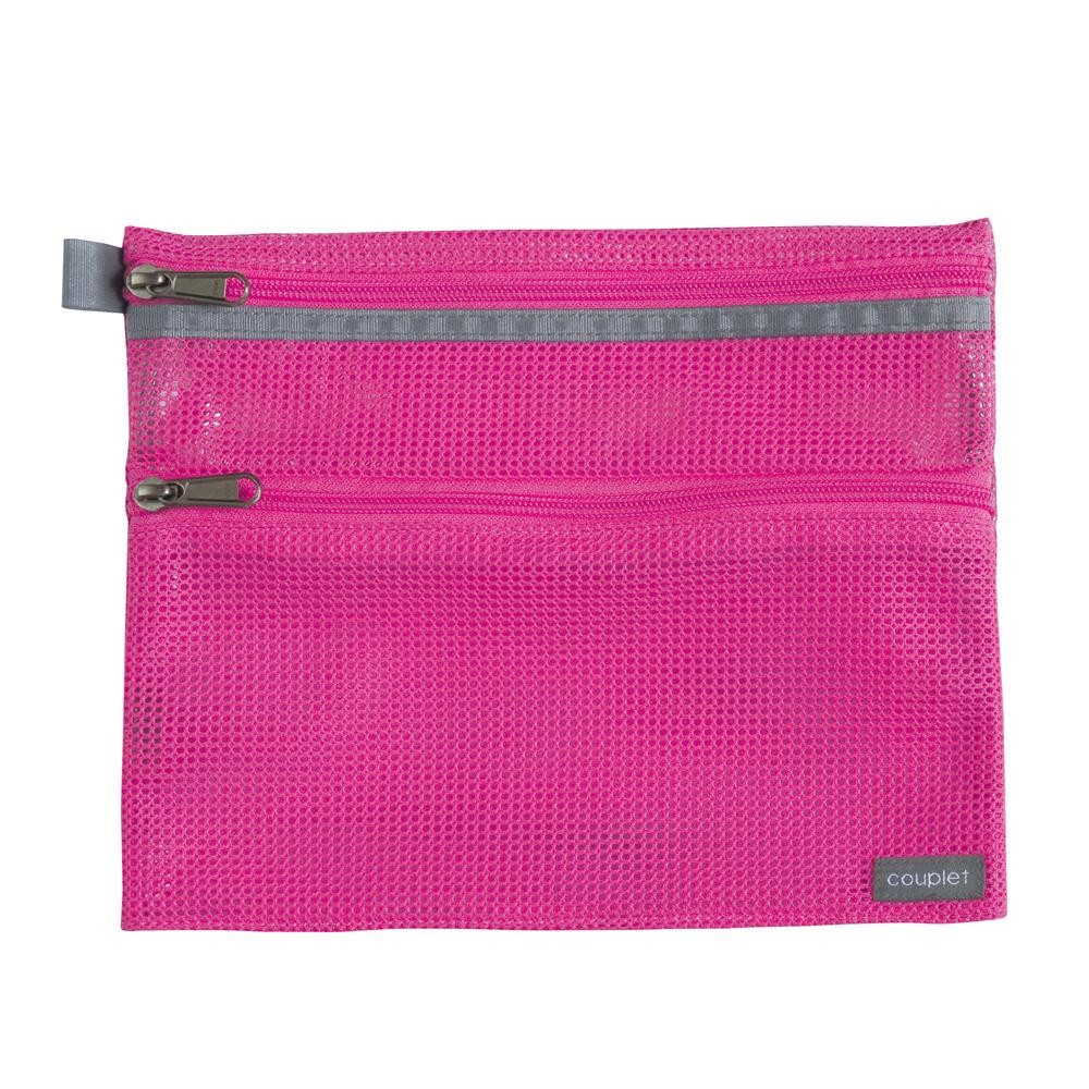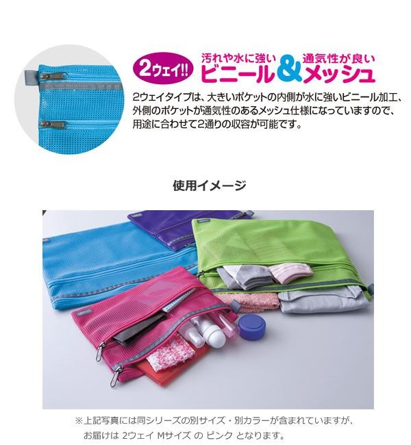 大きいポケットは化粧品などの液体が入った容器を入れるのにも安心な内側ビニール加工、小さいポケットは通気性のあるメッシュ仕様です。用途に合わせて2通りの収容が可能です。 |