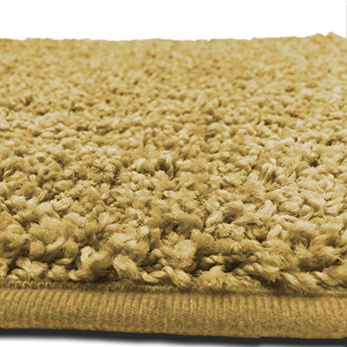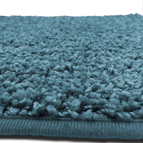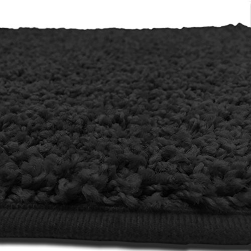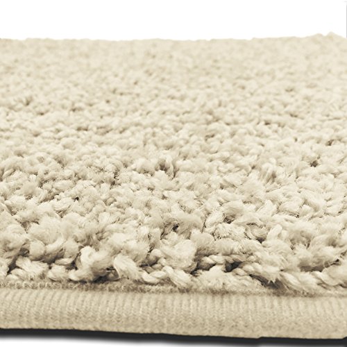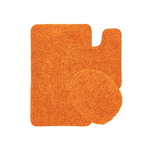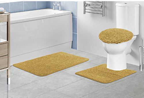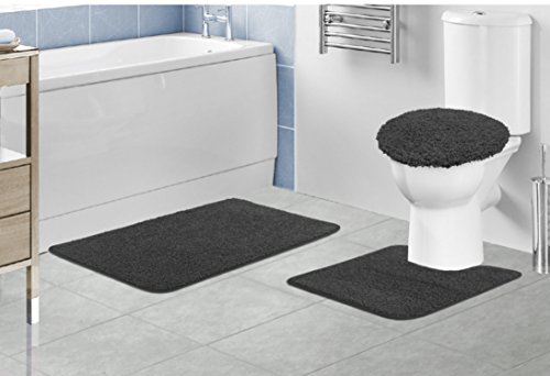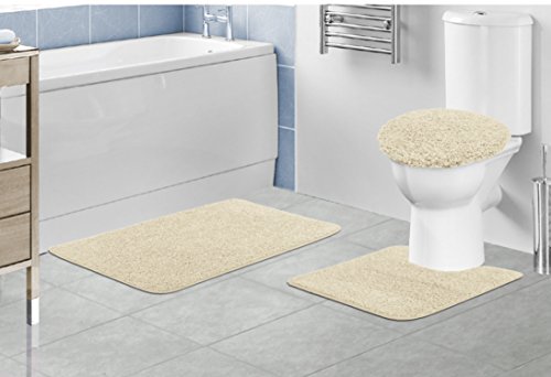 -. Feature : Quality Shaggy 3 Piece Bathroom Rug Set with Solid Color Design that looks beautiful and match any décor / Made of soft & comfortable 100% High Polypropylene Pile / Anti Slip, Non-Skid Rubber back : Prevents rug from sliding / Set includes : (1)18"x30" Bath Mat, (1) 18"x18" Contour Rug, (1) Universal toilet seat lid cover (measured approximately at 13"x16" - does not fit elongated seat) / Easy to clean : Machine wash in cold water with like color. Hang dry.