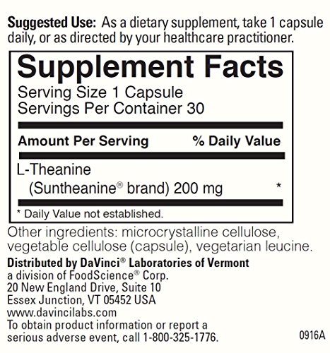 -. Feature : A dietary supplement that helps promote a restful state.* L-Theanine has shown the ability to promote deep muscle relaxation and improved quality of sleep.* Its known for its calming effects in the brain and is shown to support increased concentration and focus while reducing irritability.* DaVincis L-Theanine is the Suntheanine brand, which means it is 100% pure L-Theanine in a patented, pharmaceutical grade form. / STRENGTH IN EXPERIENCE: For over 40 years, DaVinci Laboratories has been a leader in nutritional research, product development and innovation from its home state of Vermont. DaVinci Laboratories is a family-owned and managed company. Every day, DaVinci continues to set new standards for quality and product innovation so they can keep you as healthy and informed as possible. / STRENGTH IN NATURE: The raw materials used in DaVinci products are as natural as possible and are guaranteed to contain no artificial flavorings, preservatives, colors, sweeteners or other foreign agents unless otherwise stated on the label. / STRENGTH IN INTEGRITY: DaVinci Laboratories is one of the few companies to offer you truth in labeling. Pledging total truth in labeling means the DaVinci family of products contain only the purest and most potent ingredients. Guaranteed. / STRENGTH IN RESEARCH: DaVinci Laboratories' research focuses on the complex relationships that exist among nutrients and the latest advancements in nutritional therapies to develop and produce some of the most significant products available. The Research and Development Department is under the direction of a Ph.D. Nutritional Biochemist.