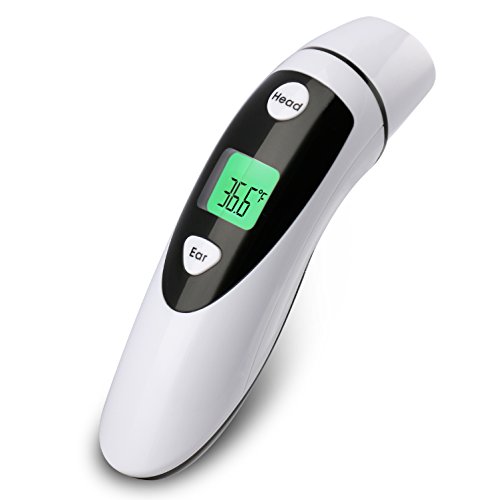 -. Feature : Accurate and Reliable: With advanced infrared technology, our thermometer is proven to be of high quality, accuracy and reliability.The measuring range of the thermometer is between 32.0℉-212.0℉(0℃-100℃).You can rely on it when you need it. / TWO in ONE: Get incredibly rapid reading in 1 sec with 2 different modes, forehead and ear! You can get the readings in 1 sec after using the thermometer.It has the simplest operation compared with mouth thermometer for children. / Memory Recall: A maximum of 20 previous readings is available to help you track the changes of body temperature. / Fever Warning: When the reading exceeds 37.5℃/99.5℉,users will be warned that he/she may have a fever by rapid and short rings and the flashing red backlight. / Safe and Hygienic: No more danger of swallowing mercury compare to mercury thermometer,it's totally safe for children to use.We also offer a pouch making it portable and 2 batteries (AAA)are included.