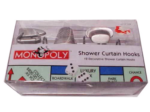 - Set of 12 decorative shower hooks are shaped like the game pieces from a Monopoly Game