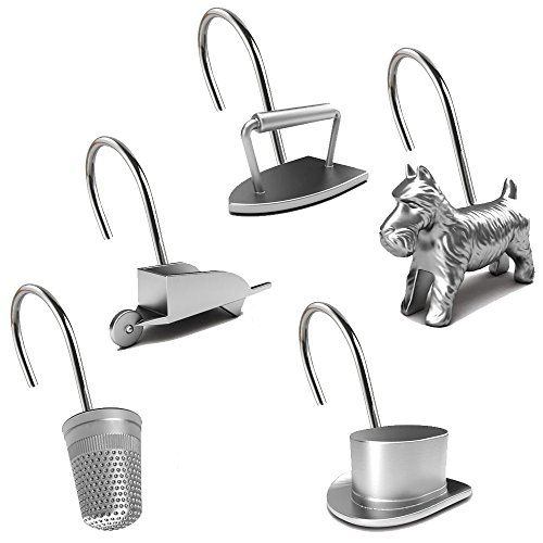 - The silver tone shower hooks resemble: a top hat, race car, thimble, wheel barrow, Scotty dog and an iron.