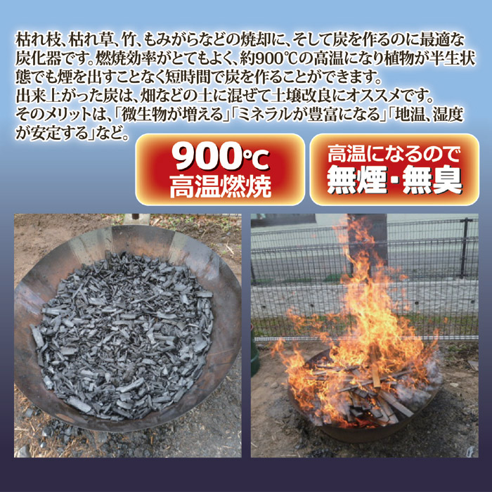 ●燃焼効率がとてもよく、約900℃の高温になり植物が半生状態でも煙を出すことなく短時間で炭を作ることができます。