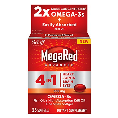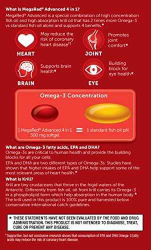 MegaRed Advanced 4 in 1 is a special combination of high concentration fish oil and high absorption krill oil that has 2 times more Omega 3s vs. standard fish oil alone. Our most advanced Omega-3 supplement to date brought to you by one of the leaders in omega 3 supplements, MegaRed. And this advanced formula goes beyond just heart health. 4in1 supports and provides benefits to 4 areas in the body - heart, joint, brain and eyes. Heart - May reduce the risk of coronary heart disease. Joint- Promotes joint comfort. Brain - Supports brain health. Eyes - Building block for eye health.*Feature