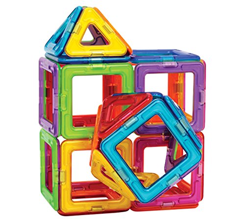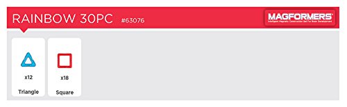 Magnetic construction set includes 30 pieces total, 18 squares and 12 traingles in assorted rainbow colors for endless fun and building for ages 3+