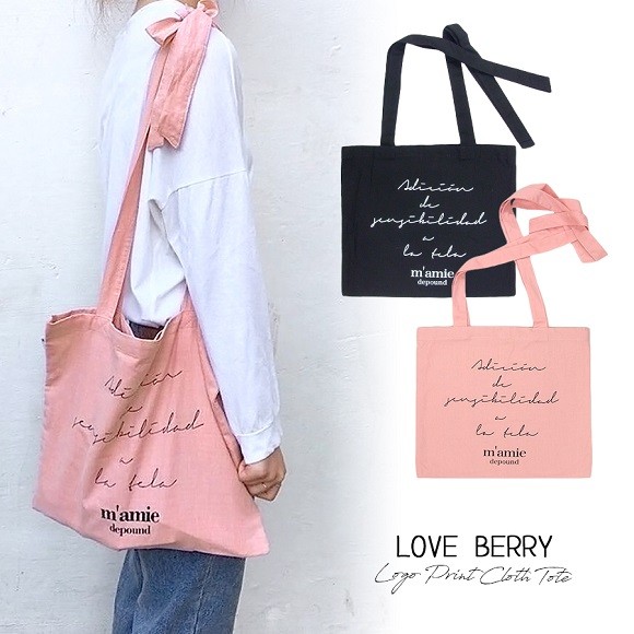 英字のロゴプリント&肩紐リボンがお洒落な布バッグ♪