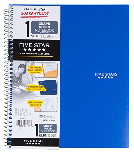 Five Star Spiral Notebook, Graph Ruled, 1 Subject, 8.5 x 11 Inches, 100 Sheets, Assorted Colors (06190), Pack Of 6