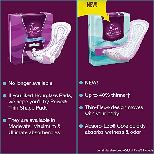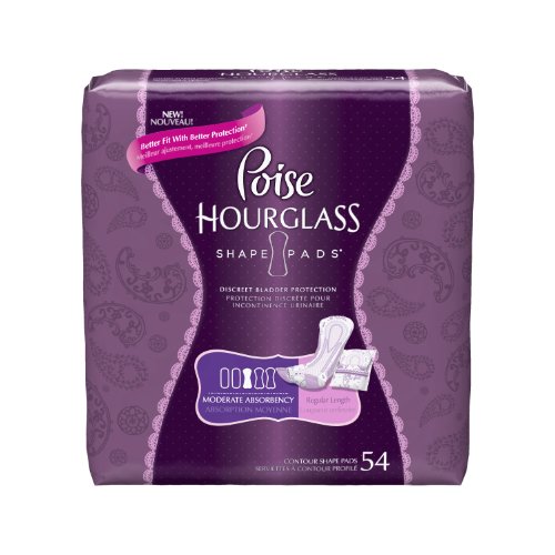 Poise pads offer outstanding protection against leaks and are designed to provide better absorbency than period-only pads. Poise Hourglass shape Moderate Absorbency pads have a triple-layer absorbent core that quickly locks away wetness and odor. With these pads, you can stop worrying about bladder leakage and move on with your day.