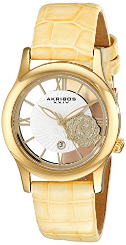 Akribos XXIV Women's AK837TN Quartz Movement Watch with Yellow Gold and See Thru Flower Dial Featuring a Beige Leather Strap