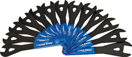 Studio : Park Tool Publisher : Park Tool Binding : Misc. Product Description Park Tool makes some of the nicest cone wrenches this side of what you'd find inside a vintage Campagnolo Professional Tool set. And while many of today's modern hubs lack wrench flats for bearing adjustments (or lack bearing adjustments for that matter), some still do, and that's why you'll need the proper tools for the job. And Park's SCW-Set.2 Cone Wrench Kit will have you covered. This complete set of cone wrenches has one of each size from 13mm to 24mm in one mm increments, plus a 28mm wrench. Park Tools Cone Wrenches are cut from high quality tool steel and have a blue vinyl dipped, extra long handle to comfortably leverage those stubborn parts.