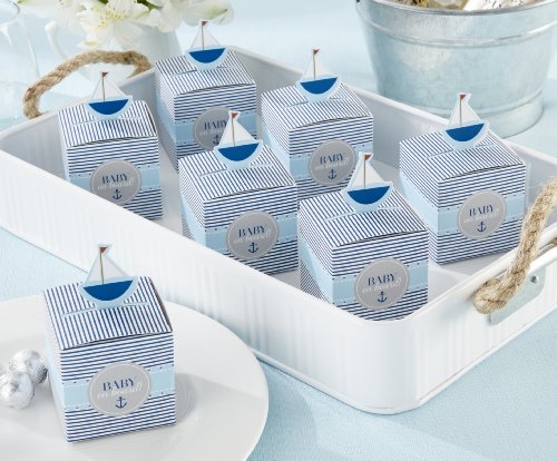[Product Information]- Nautical-themed, baby shower favor box in navy-and-white stripes with baby-blue center band and pop-up sailboat on top