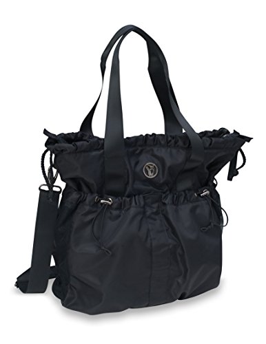 Product Description Large, jet-black stylish dance tote bag for leading dancers. Luxurious look and feel unlike ordinary dance bags. Full zip main closure plus cinch-pull drawstrings. 4 deep pockets outside: 2 cinch-close in front plus 2 full zip in back. Inside: 1 large zip pocket, 1 zip mesh pocket, 1 open-top mesh pocket. Bright, multi-colored modern lining. Adjustable shoulder strap with moveable pad and black metal carabiner clips for speedy on/off. Wide, oval-shaped bottom. Medium-large, 16" x 16" x 6.5". Material: soft microfiber. 0