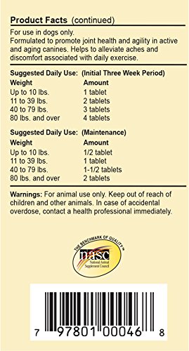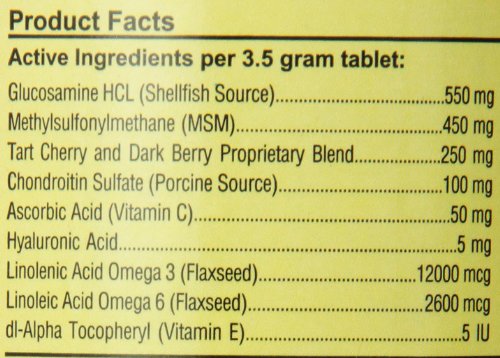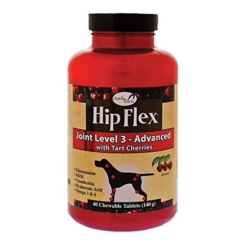 Overby Farm Hip Flex Joint Level 3 Advanced Care with Tart Cherries Formulated for Pets in Need of Advanced Joint Care. Advanced Formula Contains Glucosamine, MSM, Chondroitin, Hyaluronic Acid, Omega 3 and 6 Fatty Acids for Added Joint Support. Great for Senior Pets and those Recovering from Joint Related Injuries or Surgery. Helps Alleviate Aches and Discomfort Associated with Daily Exercise. Tart Cherry Concentrate is a Natural Antioxidant and Helps to Avoid Discomfort by Supporting the Body's Normal Inflammatory Response. Chewable, Tasty Tablets, 90ct for Dogs. Recommended to Double the Suggested Daily Amount for the First 3 Weeks. Active Ingredients per 3.5 Gram Tablet: Glucosamine, Methylsulfonylmethane, Tart Cherry and Dark Berry Proprietary Blend, Chondroitin Sulfate, Ascorbic Acid (Vitamin C), Hyaluronic Acid, Linolenic Acid Omega 3, Linolenic Acid Omega 6 and di-Alpha Tocopheryl (Vitamin E). All Overby Farm Products are Veterinarian Formulated and Manufactured in the USA in an FDA Audited, cGMP Compliant Facility with a 100% Satisfaction Guarantee.Feature