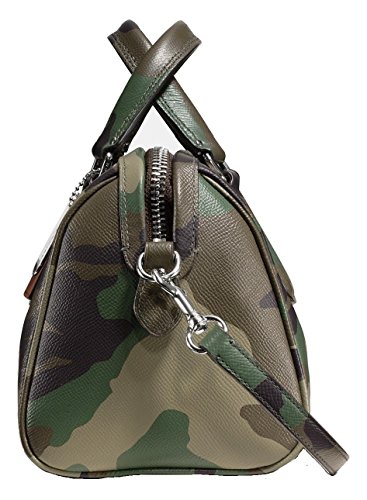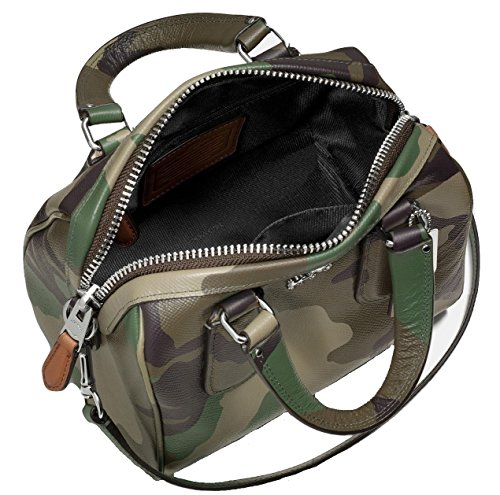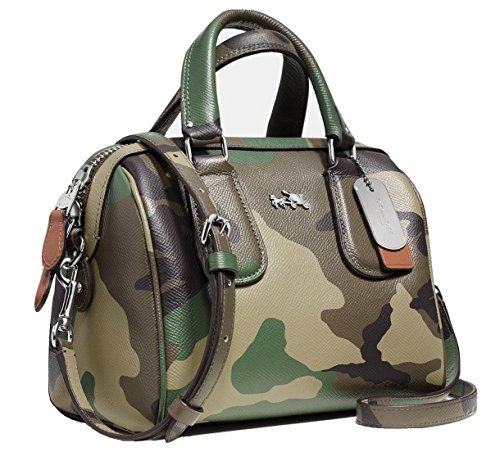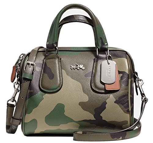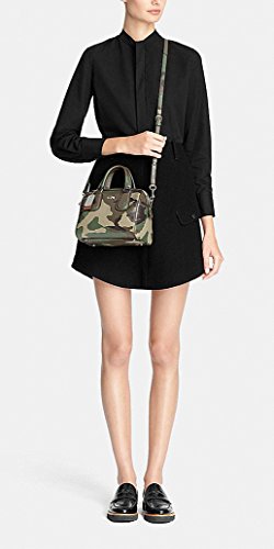 -. Binding : Apparel -. Brand : Coach -. Color : GREEN Multicolored -. Department : womens -. EAN : 0888067507256 -. Feature : Camo-print leather / Inside zip, cell phone and multifunction pockets / Zip-top closure, fabric lining / Handles with 3 1/2" drop, Adjustable strap for shoulder or crossbody wear / 7 3/4" (L) x 6 1/4" (H) x 4 3/4" (W) -. Model : 33591 -. PackageQuantity : 1 -. ProductGroup : Apparel -. ProductTypeName : BAG -. Size : Small -. Title : Coach Mini surrey satchel in camo print crossgrain leather STYLE 33591 SILVER/GREEN MULTI -. UPC : 888067507256 This darling little satchel, a mini version of the Surrey, is crafted in textured leather with a witty camo print inspired by an authentic military motif. Its playful proportions are finished with top handles and a detachable crossbody strap. Highly Sought After Rare Limited Edition In Print Leather - 33591 SILVER/GREEN MULTI CAMO Camouflage Satchel