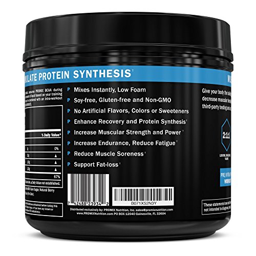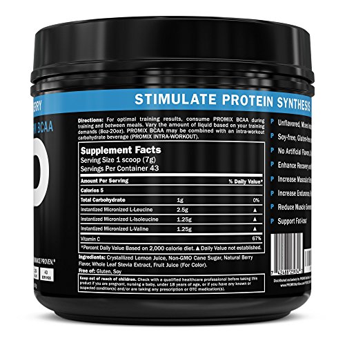 ReleaseDate : 2017-10-16 Studio : ProMix Nutrition Publisher : ProMix Nutrition Binding : Health and Beauty Product Description Get the essential amino acid building blocks you need to improve your training regimen and reach your weight loss goals with this tart, pre-, intra-, and post-workout drink. MORE ENERGY. MORE MUSCLE: If you're looking for a way to energize your workouts, push yourself further, and reduce your recovery time, the PROMIX BCAA is for you. Have a pre-workout drink for a boost of energy and greater endurance during your routine. Our formula also helps to reduce muscle soreness, and cut down on recovery time so you can continue to push yourself. GET LEAN, STAY STRONG: Branched chain amino acids are a vital supplement for cutting weight and getting lean without diminishing your muscle mass. The PROMIX formula gives you the best of both worlds with a diverse collection of BCAAs to fight muscle loss and also improve your muscle strength, and power. PROTEIN SYNTHESIS: Our BCAA drink provides a healthy dose of the essential amino acids: Leucine, Isoleucine, and Valine. These free-form BCAAs do not need to be digested and are immediately absorbed, providing the muscles with energy and stimulating protein synthesis so you can work harder without metabolizing muscle tissue and see results faster with improved recovery. Start at the cellular level for a full body boost. TOP QUALITY STANDARDS: Our formula is completely soy free, gluten free, and non-GMO. It also contains no artificial flavors, colors, or sweeteners - 2.5g Leucine, 1.25g Isoleucine, and 1.25g Valine - 300g Drink Mix 0