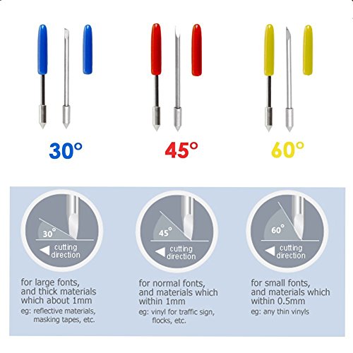 Usage: 30° Blades (Blue cap) for Cutting large fonts and thick materials which about 1mm. (e.g.: reflective material, masking tapes, etc.) 45° Blades (Red cap) for Cutting general fonts and vinyl film. (e.g.: vinyl for traffic sign, flocks, etc.) 60° Blades (Yellow cap) for Cutting very small font intricate line-art logos. (e.g.: any thin vinyl)
