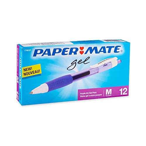 -. Binding : Office Product -. Brand : Paper Mate -. Color : Purple -. EAN : 0716410012136 -. Feature : Specially formulated gel ink writes smooth every time for a superior writing experience. / Contoured grip keeps the pen comfortably in your hand to prevent fatigue. / Pigmented gel ink for bold, vibrant color. Visible ink supply so you know before you run out. / Retractable tip protects pockets and purses. -. Label : Paper Mate -. Manufacturer : Paper Mate -. Model : 1746327 -. MPN : 1746327 -. NumberOfItems : 1 -. PackageQuantity : 1 -. PartNumber : 1746327 -. ProductGroup : Office Product -. ProductTypeName : WRITING_INSTRUMENT -. PublicationDate : 2009-09-25 -. Publisher : Paper Mate -. Size : 12-Pack -. Studio : Paper Mate -. Title : Paper Mate Medium Point Retractable Gel Pens, 12 Purple Ink Pens (1746327) -. UPC : 716410012136