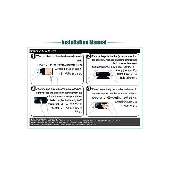 강화 유리 필름 붙여 분(쪽,편): 1,스마트 phone 표면의 먼지나 얼룩을 크로스에 예쁘게 닦아냅니다.2,접착면의 보호 필름을 벗깁니다.3,코너와 홈《보단》의 위치를 합해,화면상에 얹습니다.4,코너4점을 설치합니다,이 때점에 위치가 어긋나 있으면 수정합니다.5,위치가 정해지면,중앙에서 상아래에 유리 필름을 붙여 붙입니다.6,다음으로,중앙에서 상하 좌우로 유리 필름을 강요 기포가 들어 가는 것을 막습니다.7,밀착 하고 있지 않은 개소나 파상의《무라》이 생겨 버린 경우는 위로부터 강하게 강요합니다.