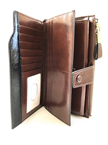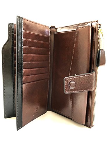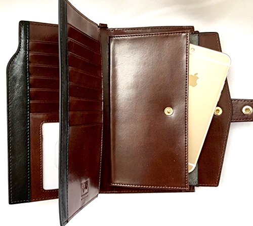 21 card compartments, 3 large pocket compartments, 1 snap closure envelope pocket with fits a cell phone and a zippered compartment that also fits a cell phone