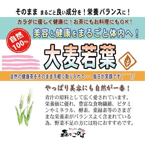 | 大麦若葉 |  | | oomugiwakaba 大麦若葉はイネ科の一年草で、世界各地で栽培されています。 カルシウム、鉄、亜鉛などの各種ミネラル、ビタミンC、βカロチンなど、優れた成分を豊富に含んでおり、普段の生活での不足しがちな栄養素を補給してくれます。 また、クロロフィルを多く含んでいるため、健康維持に繋がるというわけです。 | 食べ過ぎ、飲みすぎの方や、イライラしたり、心配事でチクチク・・・といった方にもパワーを発揮してくれます。無添加・天然国産大麦若葉100%のとても優れた健康茶です。 葉緑素がたっぷり!さまざまな栄養成分をバランスよく豊富に含んでいる! | 女性の方にとっても嬉しい食物繊維も豊富に含まれています! 大麦若葉の特徴として、これらの栄養素がバランス良く含まれており、そのほとんどが他の穀物よりも多量に含まれています。 大麦若葉の栄養成分には、タンパク質をはじめビタミンやミネラル、その他に食物繊維や葉緑素、SOD酵素といった健康や美容にいい成分がバランス良くたくさん含まれてますので、健康ドリンクとして有名な青汁の原料になっています。 |  | | | 本品は、熱湯を注ぐか、お料理などで過熱してご飲食下さい。 | | | 粉末の状態 |  | | ・・原産国・・・・・ 中国 農薬検査等には、全てクリアしておりますので、ご安心してお召上がり頂けます。加工は、国内で行っております。 ・・備考・・・・・ 保存方法:開封前 直射日光、高温多湿を避ける開封後密封、低湿度 ・・有効成分・・・・・ ビタミンA.ビタミンB.ビタミンC.カリウム.カルシウム.カロチン.マグネシウム・食物繊維・クロロフィル ・・カフェインの有無・・・・・ ノンカフェイン飲料 | | |