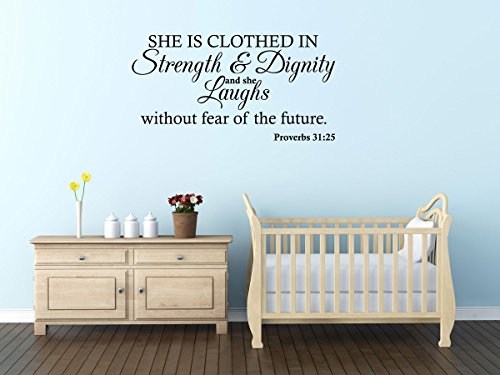 -. Binding : Kitchen -. Brand : Quote Designs -. Color : Black -. EAN : 0798154114093 -. Feature : ★ MADE IN THE USA! From 7 years indoor/outdoors self-adhesive vinyl. / ★ MADE WITH QUALITY MATERIAL: Decal is made with Oracal, a premium quality vinyl material. / ★ EASY TO APPLY: Product can be applied to any hard and smooth surface. Once the decal is on the wall the only thing left are the letters. ★ EASY TO REMOVE: No residue is left on the wall (note: decal is removable but not reusable). / ★ DECAL SIZE: 28"Wide x 13"High inches (71 cm Wide x 33 cm High). ★ Decal Color: Black. / ★ EASY TO HANDLE: The whole quote comes on a single decal which peel and sticks to the wall. -. IsAutographed : 0 -. Label : Quote Designs -. Manufacturer : Quote Designs -. MPN : 14147203 -. PackageQuantity : 1 -. PartNumber : 14147203 -. ProductGroup : Home -. ProductTypeName : HOME -. Publisher : Quote Designs -. Size : 28"W x 13"H -. Studio : Quote Designs -. Title : Wall Decal Quote Proverbs 31:25 She Is Clothed in Strength and Dignity and She Laughs Without Fear of the Future Wall Decal -. UPC : 793002680676