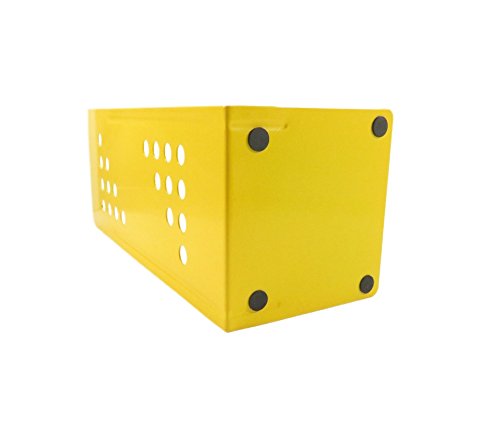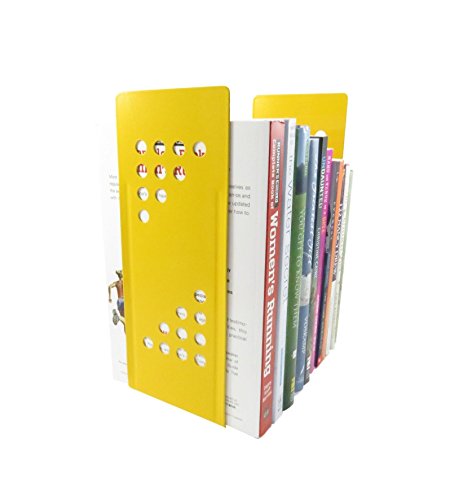 THE SPECIFICS: Set of two extra tall bookends in a bright yellow color, measuring 10" x 4" with a stylish geometric design. They are made of metal and have padded bases to prevent slipping and minimize scratches.