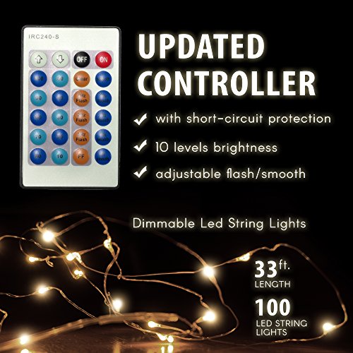 - Dimmable Led String Ligths: Updated Remote Controller with short-circuit protection, 10 levels adjustable rightness create different atmospheres for your life. 100 brilliant LED glow a warm white light, which make every night romantic starry nights. Ideal for indoor and outdoor decoration, bedroom, patio, lawn and garden, deck, porch, gate, yard, wedding, party etc.