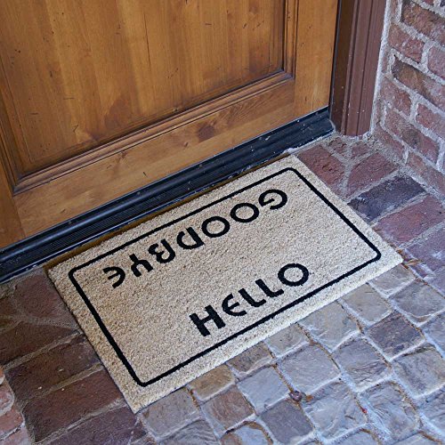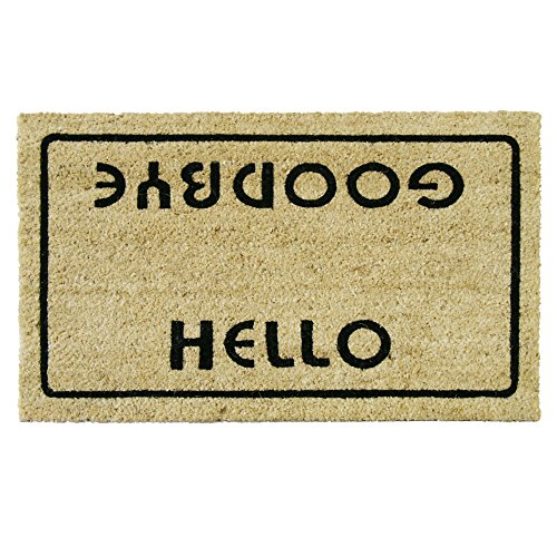 Rubber-Cal'S "hello, welcome goodbye" doormat is a humorous approach to a welcoming entry piece. It provides a warm welcome and a fond farewell for a front door welcome mat that will strike a laugh with your guests. It displays a basic design, contains eco-friendly fibers, and has the strength to last. This funny door mat contains two sides for your visitors to see, whether they are coming or going. The bleached background exhibits a simple black border and as guests arrive, they will be greeted with a "hello". On the flip side, they can view a simple "goodbye" as they step out of the threshold, indicating the conclusion of their stay. Not only does this decorative welcome mat offer proper salutations, but it also minimizes the impact on the environment. The surface materials are fibers called coir; these are derived from the husks of coconuts through an eco-conscious development process. They are woven together and lined with a PVC backing to ensure that this "green" product will last. Once constructed, this coir welcome mat will stand up against the harshest conditions. Designed with rain and snow in mind, it has a mold and mildew resistance that allows it to survive in wet areas. The tough coir fibers also provide a surface that will scrape away the outdoors from incoming foot traffic, ensuring less cleanup inside the home. If you're looking for a welcome goodbye mat that will both receive and dismiss, this humorous product is the one for you! not only will it greet, but it will also endure through the demands of the outdoors. It fits perfectly at the faade of your home, sized at 18 x 30 inches with a 5/8-inch thickness. This eco-friendly coir welcome mat will reduce your carbon footprint and make sure that none are tracked inside!.Feature