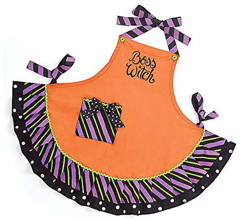 - Hand painted cotton apron with purple, green and black stripe ruffle skirt and pocket. "Boss Witch" is embroidered in black.