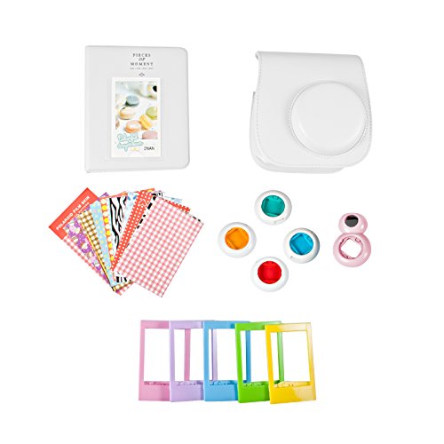 KOBRA Fujifilm Instax Mini 8 Accessory Kit – Camera Case With Adjustable Strap – 64-Pocket Photo Album, Close-up Selfie Lens, 4 Color Lenses, 5 Creative Frames, and 60 Film Décor Stickers (White)
