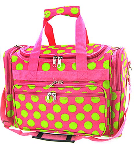 -. Brand : World Traveler -. ClothingSize : 13-inch -. Color : Polka Dots - Pink Green -. Department : womens -. EAN : 0763598168803 -. Feature : Adjustable, detachable non-slip padded shoulder strap / U-top opening provides easy access to roomy zipper secured main compartment / Metal feet allows stabiity to bag when setting down and provides bag floor not to touch floor directly to get dirty / Front exterior zip pocket with two exterior end slit pockets / Silver pewter hardware -. Model : T13-504F/G -. MPN : T13-504F/G -. NumberOfItems : 1 -. PackageQuantity : 1 -. PartNumber : T13-504F/G -. ProductGroup : Apparel -. ProductTypeName : LAGE -. Size : 13-inch -. Title : World Traveler Pink Green Polka Dots Duffle Bag 13-inch -. UPC : 763598168803