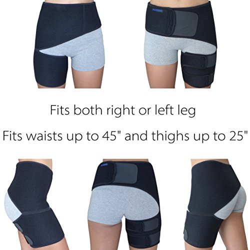 - ULTRA COMFORTABLE AND SOFT: Lightweight and breathable material of the hip and groin support fit snugly and doesn't catch on dry skin. It is very comfortable for all-day wear, quick and easy to put on and take off. Groin compression wrap designed for both men and women and can be worn on the right or left leg, under and over clothes. It fits waists up to 45" and thighs up to 25" circumference