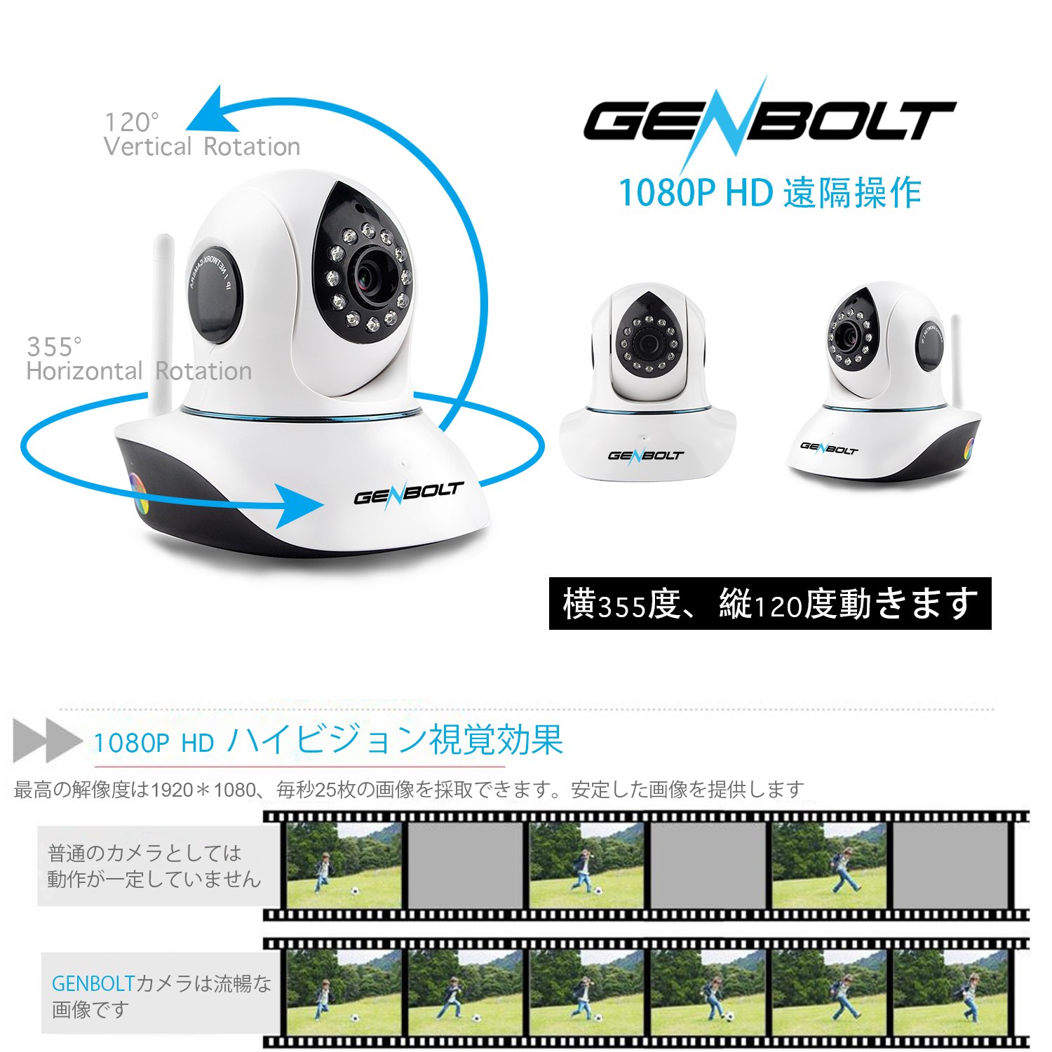 GENBOLT Wi - Fi HD pan - tilt home IP baby camera provides extensive full - scale surveillance of 350 ° horizontally (left and right) and 100 ° vertically (up and down) by swiping your finger on the screen.