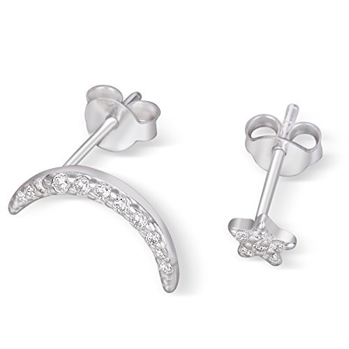 Stylish sterling & CZ moon climber & star stud lunar theme earring set