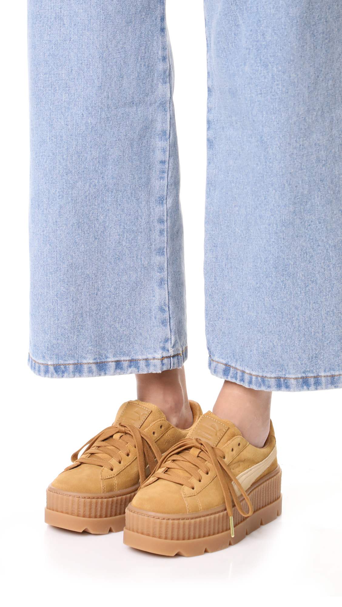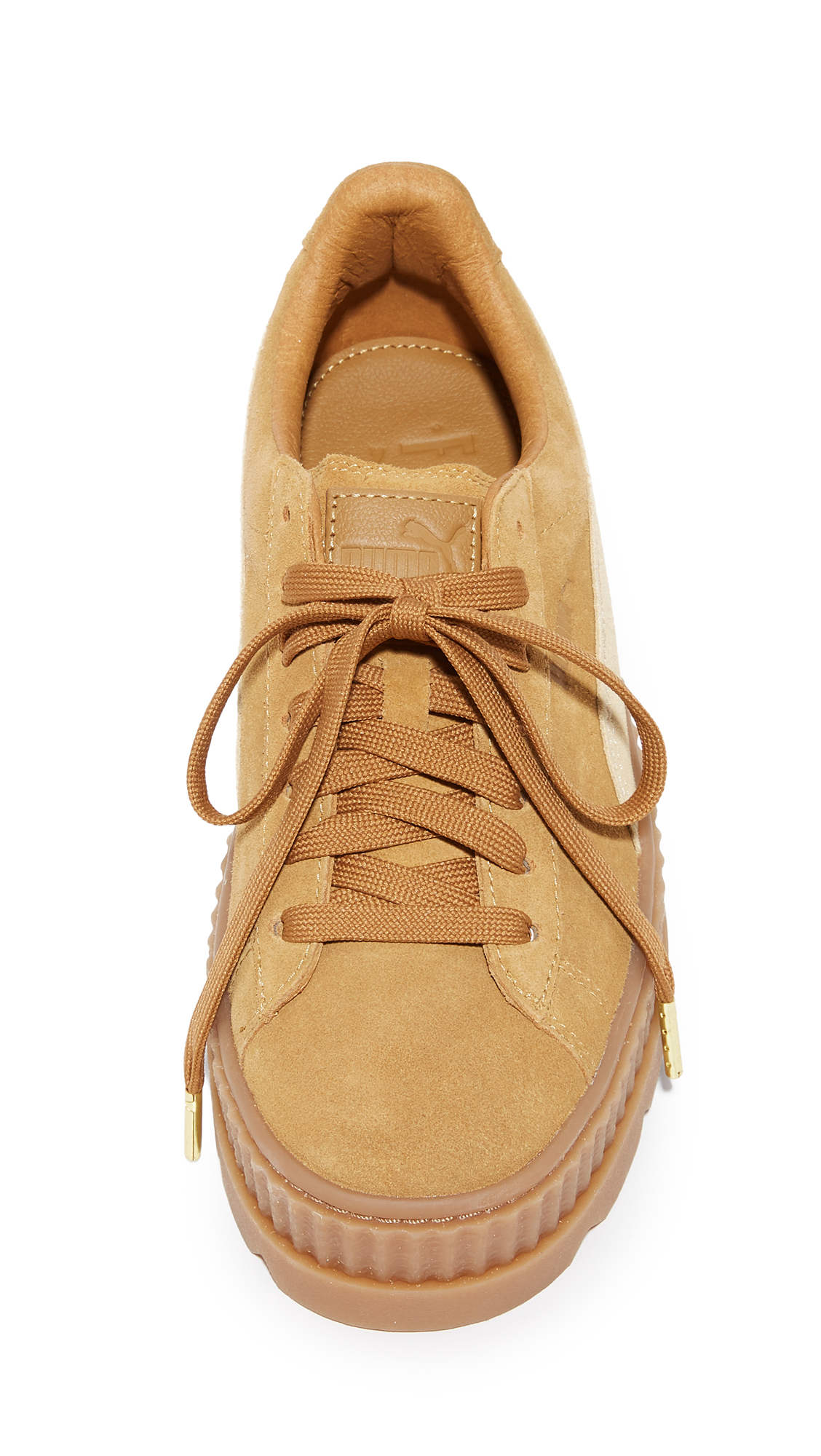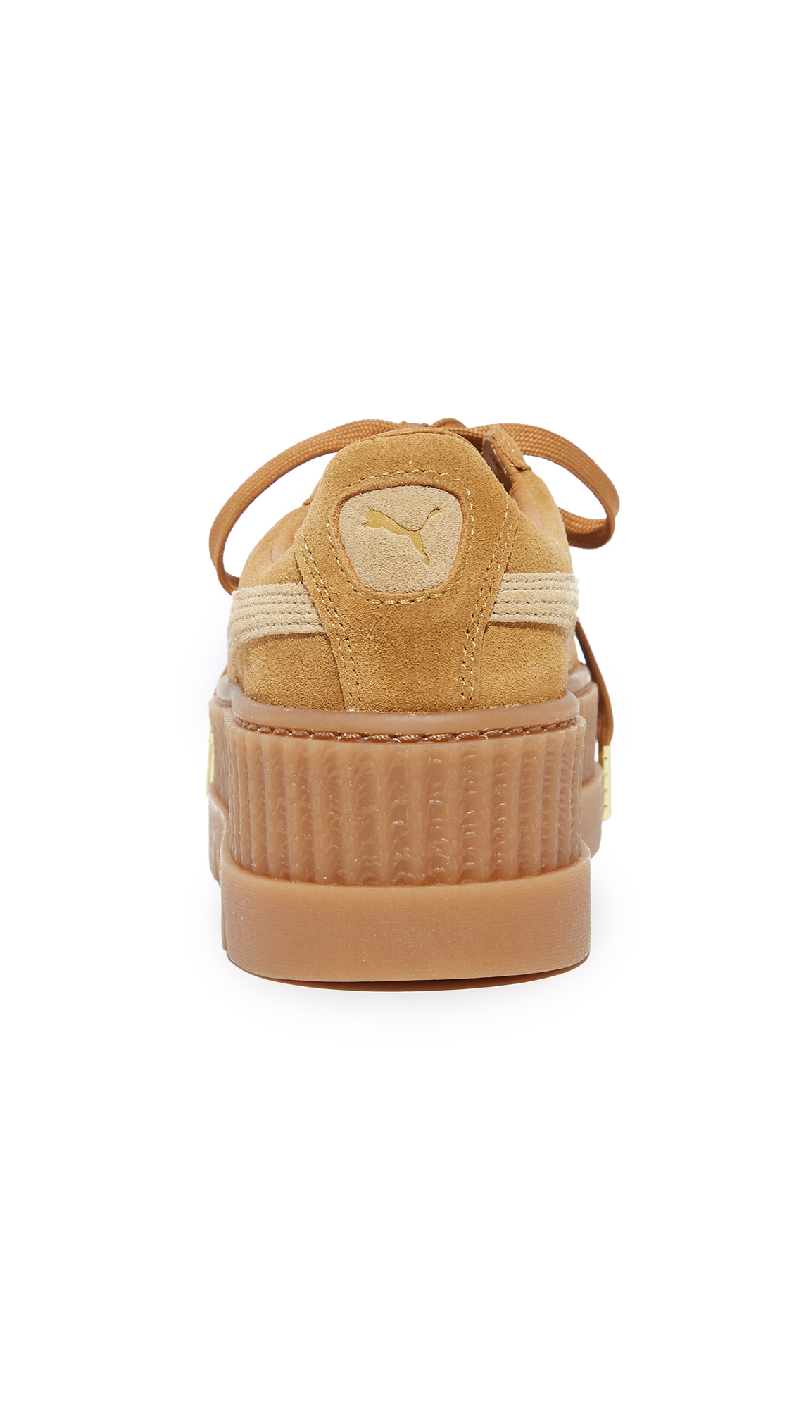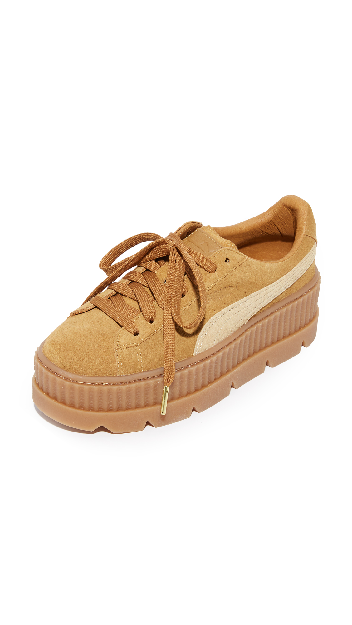 A tiered platform adds a dramatic lift to these suede PUMA sneakers. A logo swirl accents the side. Lace-up closure. Rubber sole.
