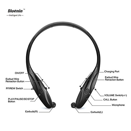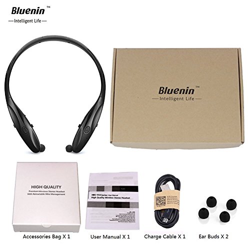 Feature : PROVIDE HIGH-FIDELITY - Stereo music and Crystal Clear HD sound. Built-in Apt-x Technology Reproduces Cd Quality Sound Over a Bluetooth Connection. Support iOS device battery display, Multi-connection up to 2 devices / SPORTS WIRELESS HEADPHONE - Sweat-proof and Water-proof; Light weight; Super long standby time up to 500 hours; 12 hours for music; 15 hours for talking, Compatible with most Bluetooth-enabled devices with 10-meter working distance / NOISE CANCELLING - With excellent sound effect collection, superior sound isolation, efficiently reduces external noise. Keep these 950 Headsets going practically all day. 950 will vibrate if you have an incoming call and alert you if your battery gets low / RETRACTABLE NECKBAND STYLE - Easily pressing the retractable cable button to adjust the length of the line; comfortable in-ear earbuds stays well in the ear when running, jogging, riding, etc / 7 DAYS NO REASONS TO RETURN - It's the perfect entertainment for relaxing at home, doing things around the house, making dinner. Bluenin Sports Bluetooth Headsets provides 7 days no reasons to return and friendly customer service