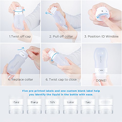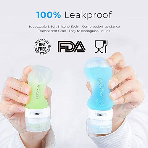 - [100% Leakproof]: Unique cross-cut (self-sealing) valve and 3-layer leakproof pretection cap can prevent leak 100%.The squeezable and soft silicone body resists extreme pressure and prevent leaks, keeps your baggage from getting dirty.