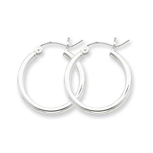 Simple and classic, our rhodium plated sterling silver round hoops feature a snap-tight hinged post and a lightweight hollow tube design that measures 2mm thick.