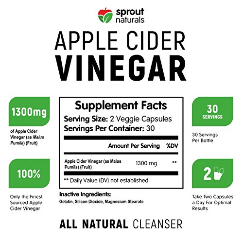 -. Feature : EXTRA STRENGTH APPLE CIDER VINEGAR CAPSULES - Our Potent Apple Cider Vinegar packs a whopping 1300mg of NATURAL Apple Cider Vinegar per serving - known by many as a natural cure-all for a multitude of conditions. Our apple cider vinegar capsules are formulated to promote healthy lifestyle changes and target ailments such as a sore throat, acid reflux, acne, circulation, weight loss, balanced PH levels, toner, digestion, dry skin, common cold, and much much more. / HELPS SUPPORT DETOXIFICATION, WEIGHT LOSS, CIRCULATION AND SPEEDING UP YOUR METABOLISM - Apple Cider Vinegar is a natural remedy that has shown to help aid in natural weight loss, digestion, improving circulation, and detoxification. Supplementing with Apple Cider Vinegar is one natural way to give your gut flora a break by cleansing your body of junk that has been accumulating. Reclaim your lifestyle and regain the vigor you deserve to have! / GOES DOWN EASY - TASTELESS - You no longer have to bear the burden of drinking foul-tasting apple cider vinegar ever again! Through the use of our easy to swallow capsules, you can easily supplement ACV into your diet without a hassle. An easy, twice-a-day solution without the Pungent taste of vinegar. These Apple Cider Vinegar (ACV) capsules are perfect for those who cannot stand the taste of liquid apple cider vinegar but wish to reap all the benefits that it bestows. / HEALTH FIRST - Sprout Naturals operates on one main P.R.Incipal - Health First. We are committed to formulating only the finest quality blends to guarantee that you are getting the best Apple Cider Vinegar out there. Our formula contains NO Nasty Preservatives, Chemicals, or anything other than what it says on the bottle. Every one of our batches is quality tested and analyzed by a third party laboratory to ensure the strictest levels of quality. Remember our Creed - Health First! / 100% MONEY-BACK GUARANTEE- It's a Win-Win, if you don't like our apple cider vinegar pills return them and we will happily give you a refund. We are confident in the quality of our product and we know you will love what we have to offer. We offer you the finest - most potent Apple Cider Vinegar without the nasty taste of a liquid variant. All of our products are made in the USA at a GMP certified Facility