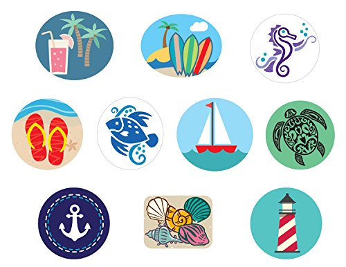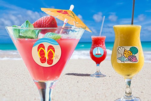 -. Feature : UNIQUE ALTERNATIVE TO WINE CHARMS AND MARKERS - Set of 10 colorful and high-quality, reusable stickers for drink glasses, windows, mirrors or any smooth surface. / BEACH PARTY DECORATIONS - Liven up your luau, summer gatherings or home decor with fun beach graphics. Each sticker is 2.25" wide. / SUMMER PARTY FAVORS AND HOSTESS GIFTS - Great way to say thanks to the party hosts! / REUSABLE! Super easy to apply and remove. Can be used over and over just like wine charms and markers, and they leave no residue on your fine glasses. / SATISFACTION GUARANTEED - If you are not happy with your purchase for any reason, we will issue a full refund.