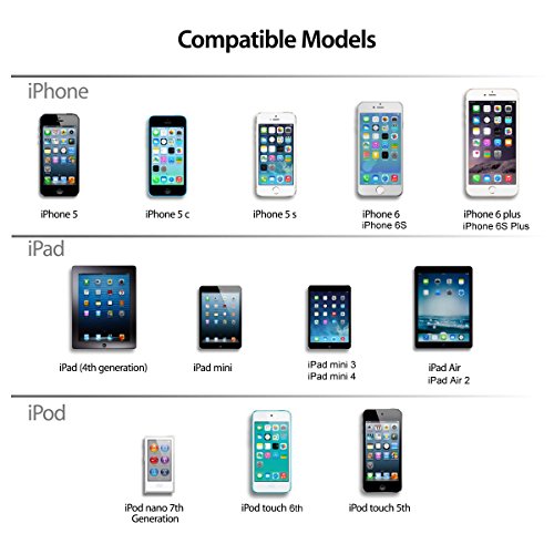 Compatible with iPhone 6S/6S Plus, iPhone 6/6 Plus, 5/5S/5C, iPad Air 2 / Air, iPad mini 4/mini 3/mini 2, and iPad 4th gen, iTouch 5th gen, iPod nano 7th gen