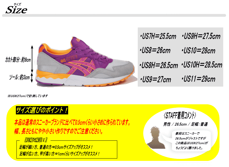 | サイズ | 作り⇒やや小さめ 【サイズ選びのポイント!】 足幅が細い方、普通の方⇒0.5cmくらいサイズアップがオススメ! 足幅が広い方、甲が高い方⇒1.0cmくらいサイズアップがオススメ! |