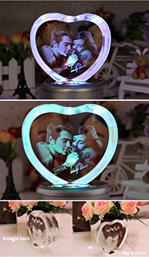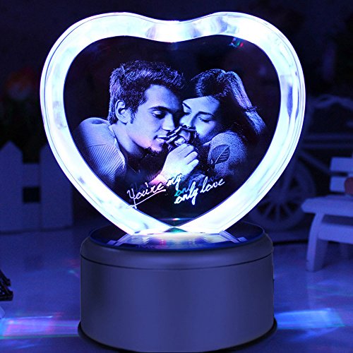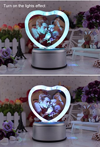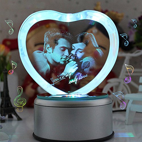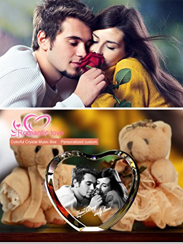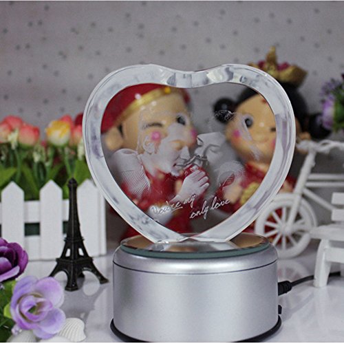 - Feature : Music Base default tracks: Castle in the Sky, Canon, rain mark, My Heart Will Go On, Yesterday Once More, Tomorrow I want to marry you, See the sea town, Romeo and Juliet etc. (18 non-replaceable absolute music). / Engraved with a couple and "You're my only love" in a Heart shaped crystal. / K9 Crystal: Pure and luxury. Advanced laser inside carving tech insures the amazing effects / Automatically rotating music box base with LED colorful lights: Gradient red, yellow, blue and green lights shine in the precious crystal Carousel when the music is flowing in the air. / The best gift for her, let Crystal Rose witness your true love.