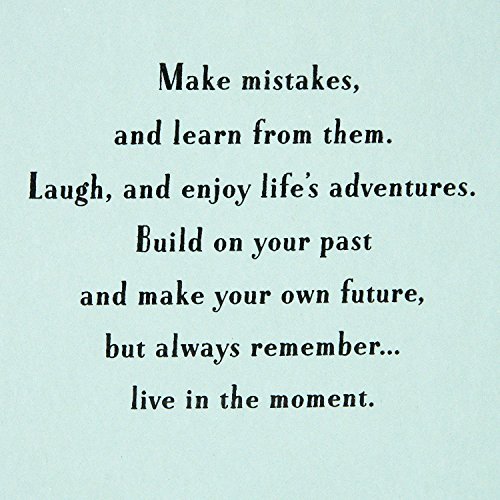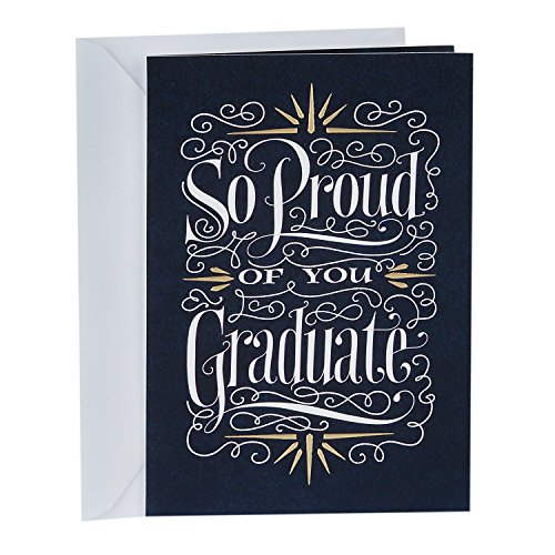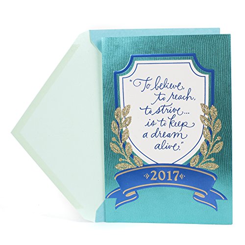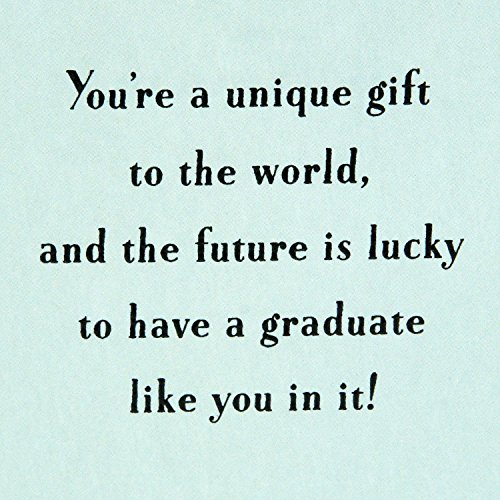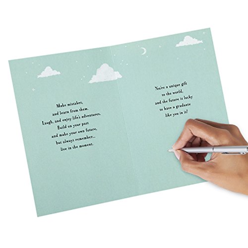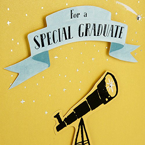 Celebrate and encourage a new graduate with this card featuring an illustration of a telescope underneath a blue banner. Printed on high quality paper stock, this graduation card is the perfect opportunity to send a celebratory note of congratulations to a friend, family member, or any recent graduate. The message on the front of the card reads, " For a Special Graduate: Life is your teacher now. Every day you'll discover new truths about yourself because you're a work in progress and that truth will free you to achieve your dreams." Open the card to reveal the inside message, "Make mistakes, and learn from them. Laugh, and enjoy life's adventures. Build on your past and make your own future, but always remember...live in the moment. You're a unique gift to the world, and the future is lucky to have a graduate like you in it!" The card measures 8.3 inches long by 5.8 inches wide; an envelope is included. All Hallmark cards are made with paper from well-managed forests. Hallmark was founded in 1910 when 18-year-old J.C. Hall arrived in Kansas City, Missouri, with a couple of shoeboxes of postcards under his arm and the American dream in his heart. Hallmark greeting cards are sold online and in nearly 40,000 retail stores across the globe and people continue to recognize the iconic Hallmark brand as "the very best."Feature