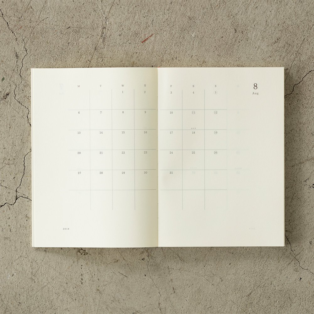 Based on "MD notebook", it is a diary composed of monthly schedule of block type, 8 division horizontal ruling memo which can be used for schedule for one week in spread, and even ruled memo page.
