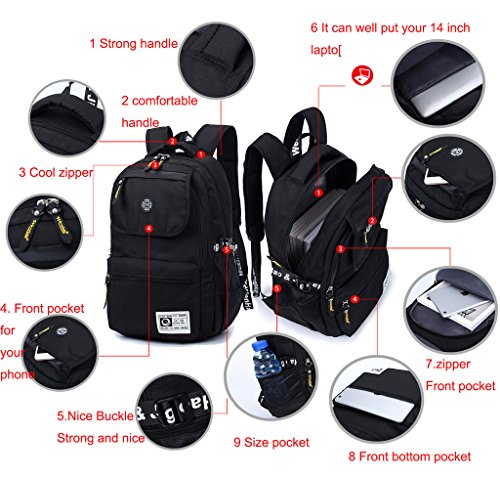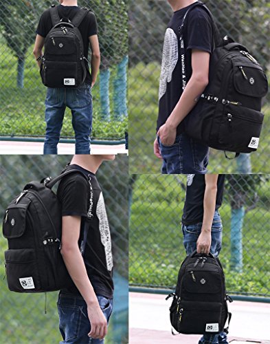 -. Feature : MATERIAL-Made of 900D WATERPRROF Nylon, high quality metal buckle and genuine zips. It's a very durable backpack. Adjustable shoulder straps for carrying comfort. / SIZE: 11.8"x7"x17.7"(L*W*H) 30cm*18cm*45cm. / COMPARTMENTS: 1 main pocket + 5 functional pockets. The main pocket is large enough to put your clothing, books and your daily things. Five functional pockets can be used for your tower, brush, magazine, water bottle, umbrella and so on. / STYLE: Eco-friendly casual life style. Great Rucksack for hiking, camping, traveling; It is also a perfect school bag for men, women, teens, girls, boys, college students . High Density Canvas Backpack/ Rucksack/ School bag/Shoulder bag/Cross body bag/sling bag. / It can well product your 14 inch laptop. Special design of the shoes compartment enables your bag to be clean and more useful.