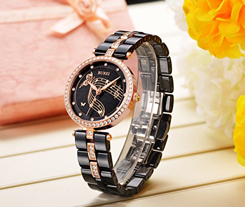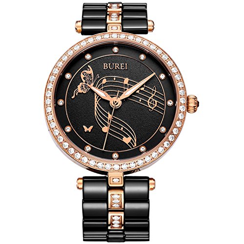 -. Title : BUREI® Women's "Elegant" Swarovski Crystal-Accented Black Ceramic and Rose Gold-Tone Watch