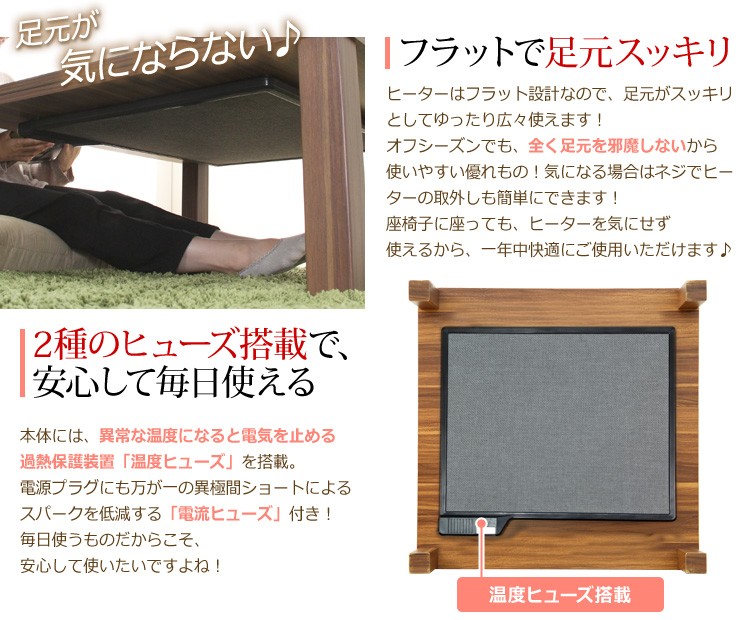 【商品について】フラットヒーターこたつ【-Talpa-タルパ(正方形・80cm幅)】(こたつテーブル+掛布団の2点セット)■サイズ:本体外寸:(約)幅80x奥行80x高さ36.5cm (約)16.5kg布団:(約)幅175x奥行175cm (約)1.7kg■カラー:(Aセット)本体:ウォールナット×布団:ブラウン(Bセット)本体:ウォールナット×布団:ベージュ■素材:天板:パーチクルボード、PVCシート脚:MDF、PVCシート※付属品:300Wヒーター(メトロ電気工業株式会社製)・無段階温度調節機能・温度ヒューズ、電流ヒューズ付布団:表地、裏地、詰め物:ポリエステル100%※洗濯可能(ネット使用)■その他:・完成品でお届けします。※脚はお客様取付け梱包サイズ:本体:(約)83x83x11.5cm(約)17.5kg布団:(約)45x45x18cm:(約)2.7kg